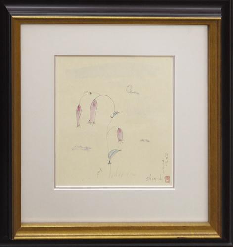 薄い赤紫と青緑の控えめな彩色が、花の儚さと静けさを表現。背景には淡い雲。 花が垂れ下がるように描かれており、重力や風の存在を感じさせる。余白が印象的。 無音の世界に咲く、か細い命のような美しさ。空気のように軽やか。
