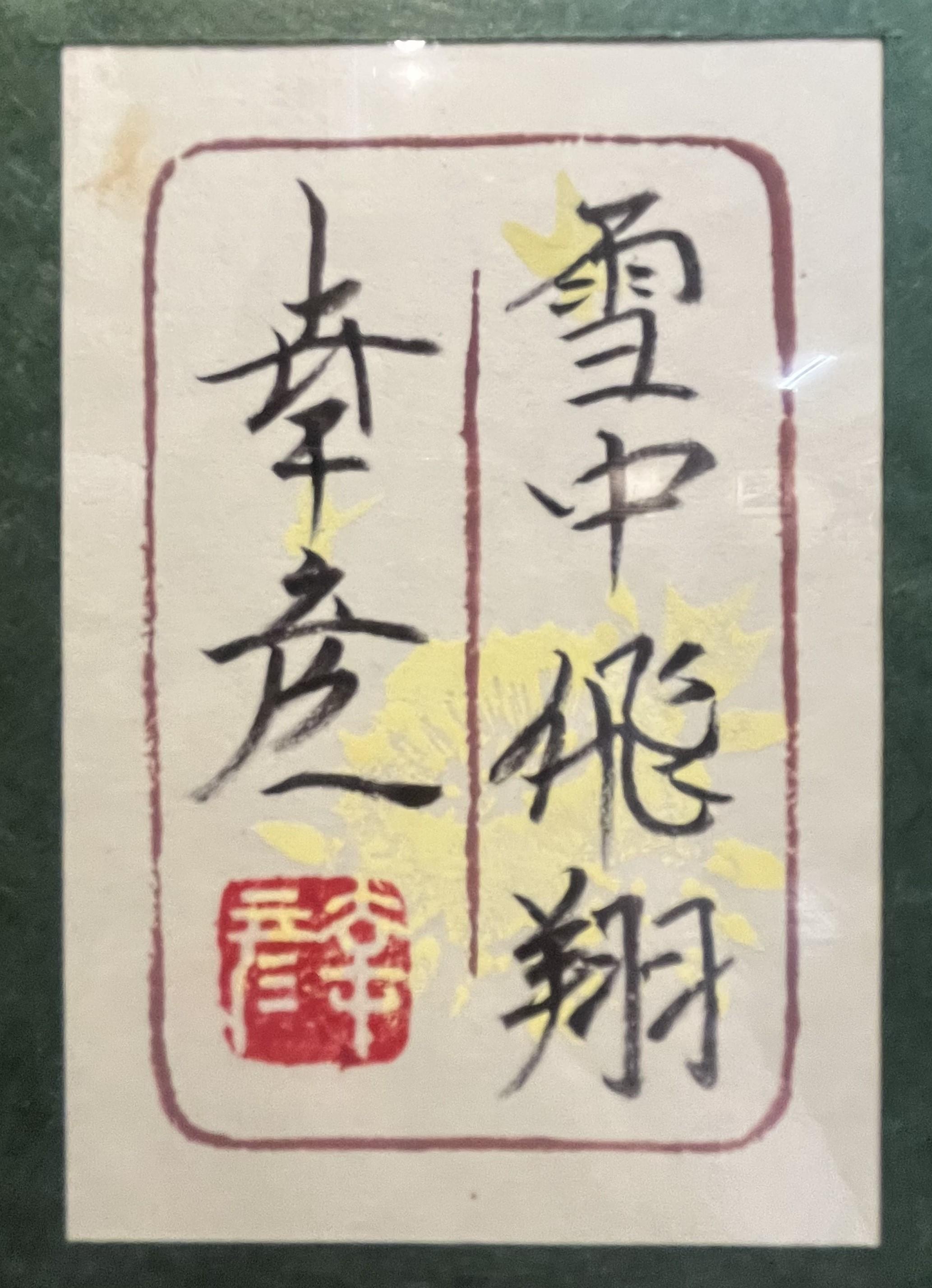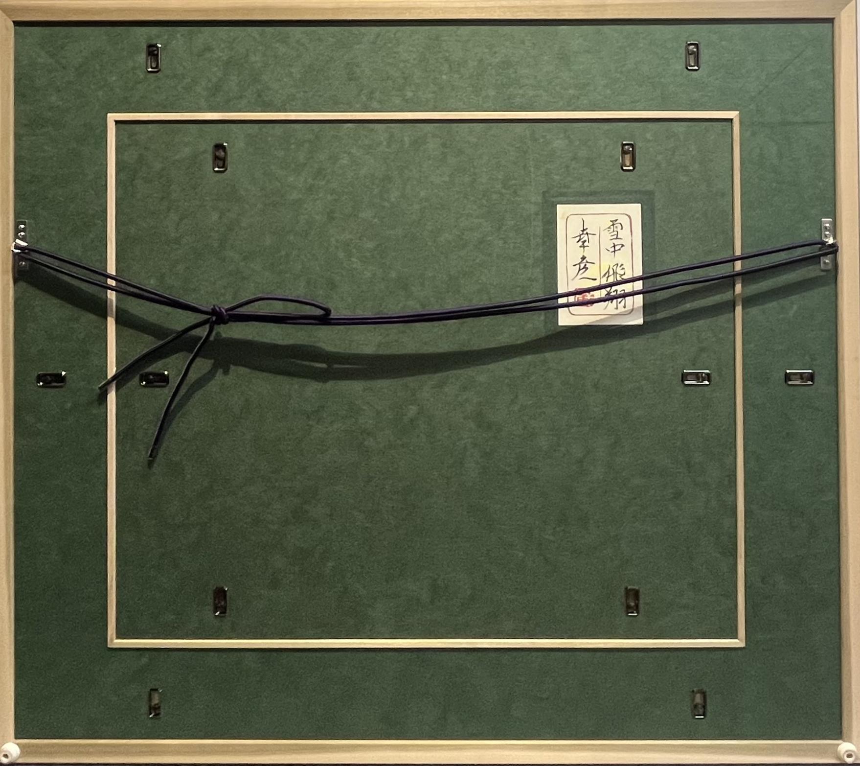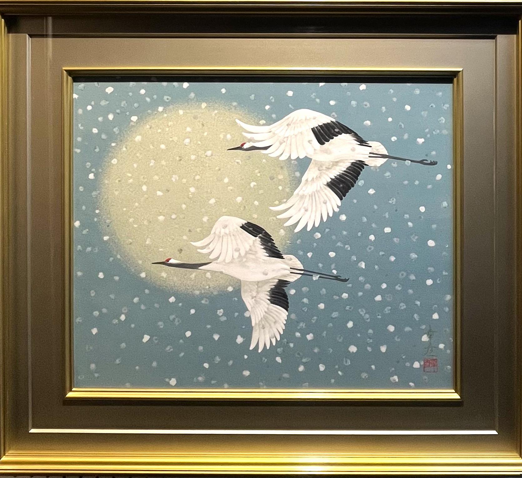 静かな雪空に浮かぶ月と二羽の鶴が、澄んだ気配と気高さを感じさせる。余白を生かした構図が美しく、凛とした空気の中にやわらかな詩情が漂い、心が洗われるような清らかな印象を受ける作品です。