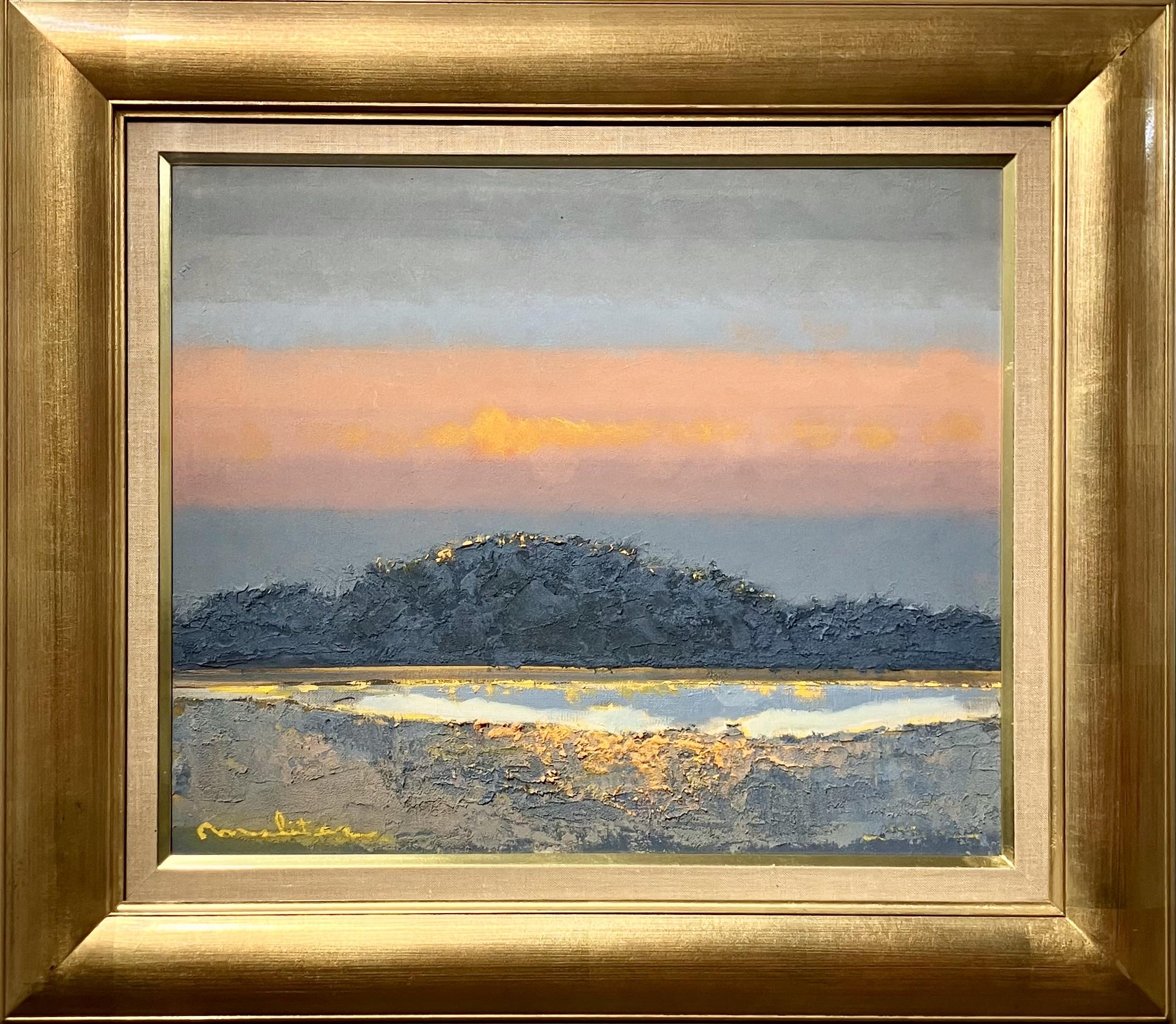 淡い夕焼けが、心を穏やかに鎮める作品。厚みのある絵肌と控えめな光のきらめきが印象的で、静寂の中に時間の流れと余韻を感じさせる詩的な作品です。