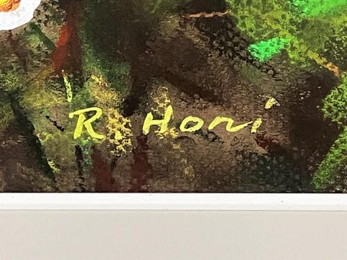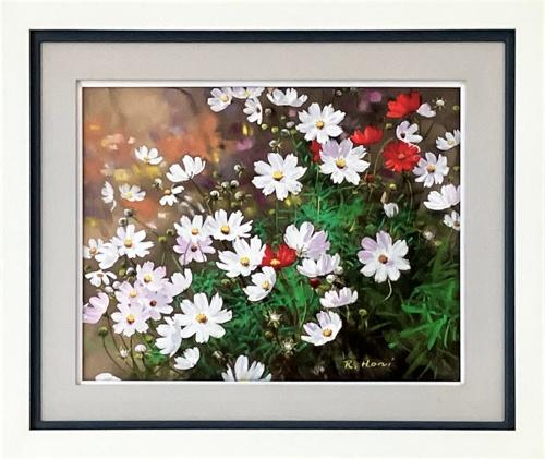 白いコスモスが画面いっぱいに咲き誇り、赤い花が鮮やかなアクセントを添える生き生きとして、背景の暖色のぼかしが奥行きと温もりを生み、秋の野辺の風を感じるような清々しく優雅な作品です。