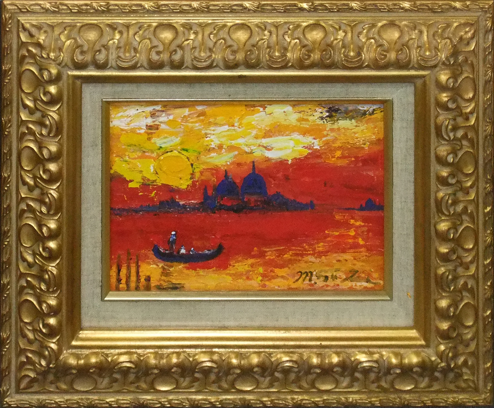 夕陽に照らされた運河が印象的な、作家の代表的ナモチーフ、ヴェネツィアを描いた作品です。