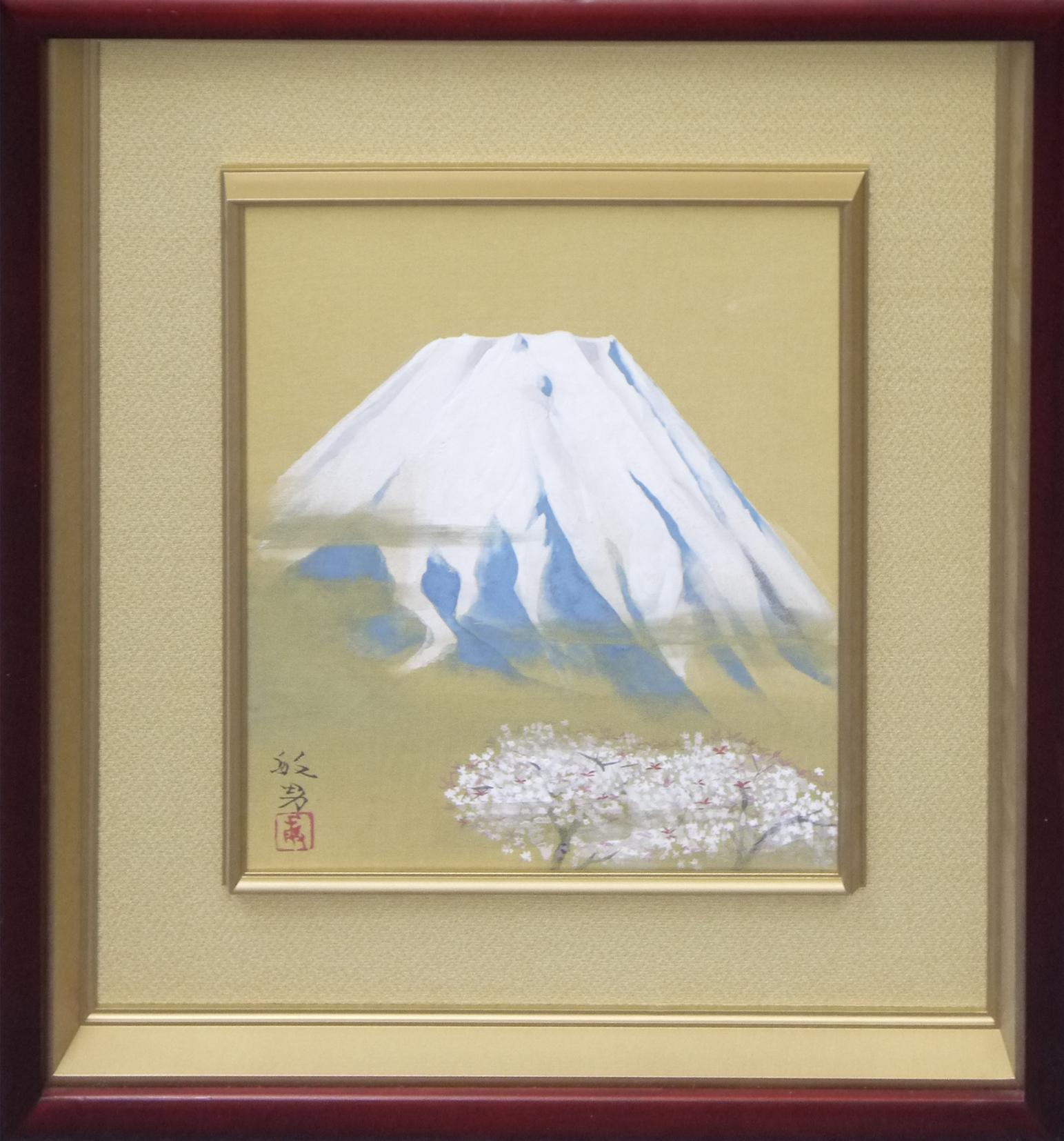 絹本の金色紙に描いた、桜と富士の組み合わせの非常に縁起も良い作品です。